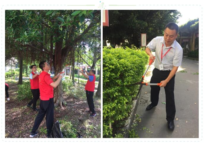 校园内热闹非凡,老师志愿者们不怕脏、不怕累,个个干劲十足,热火朝天地清扫校园,修剪绿植,不放过灌木丛中的一个塑料袋,一棵杂草,一张废纸。