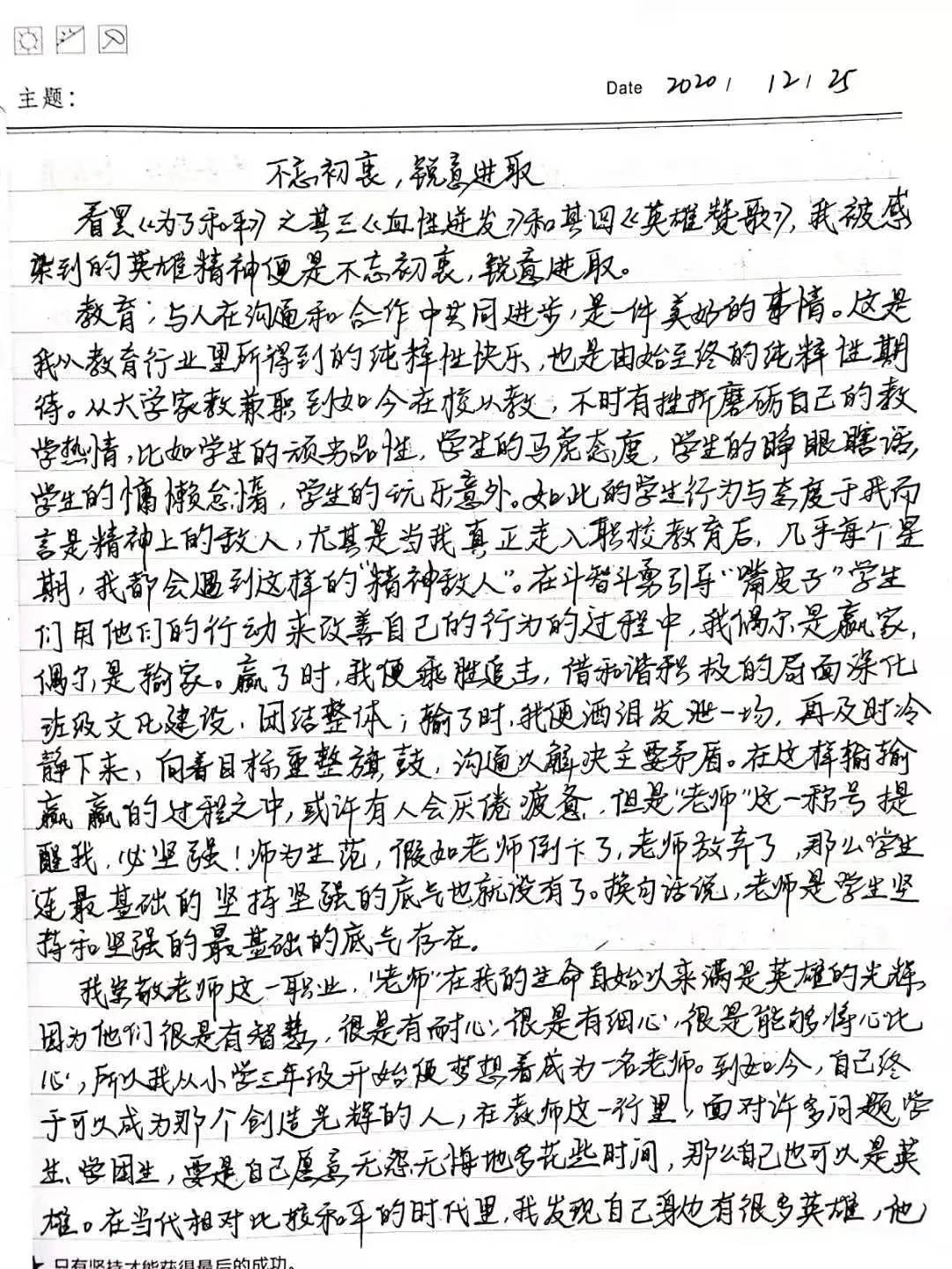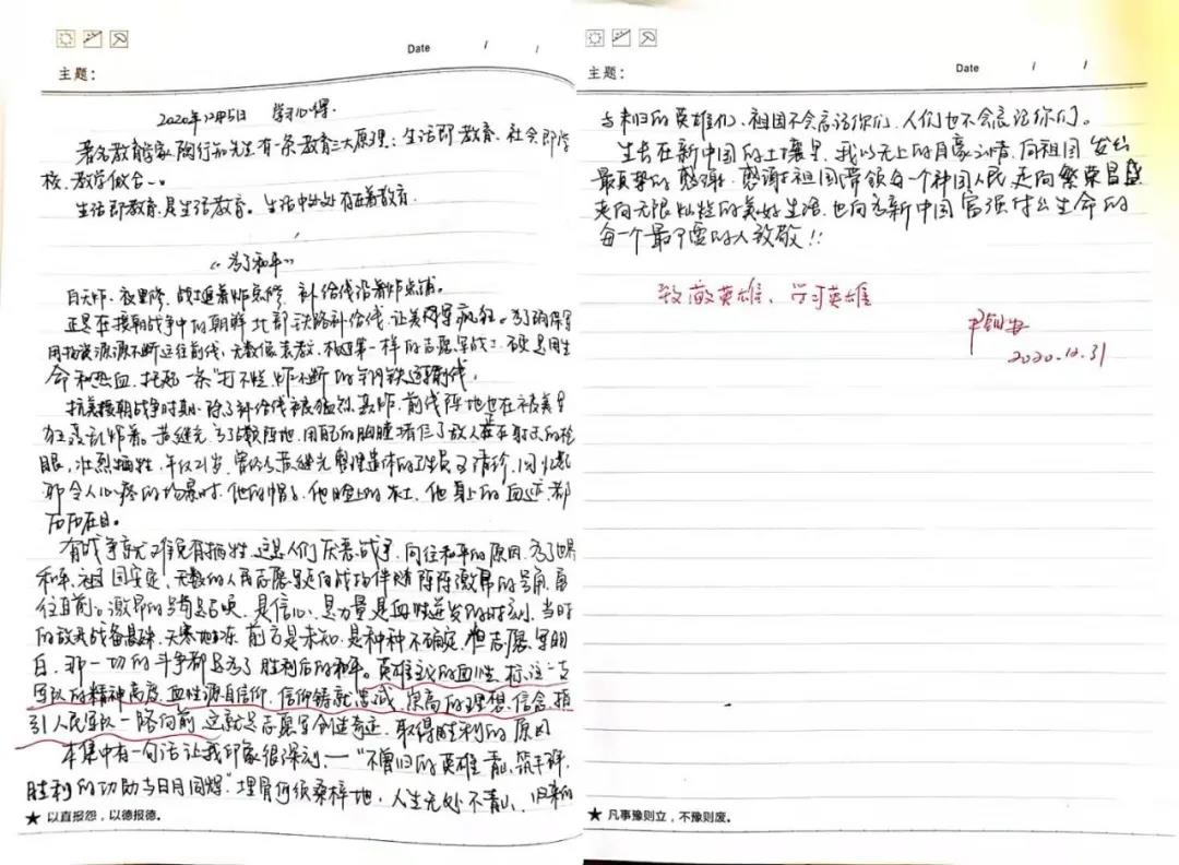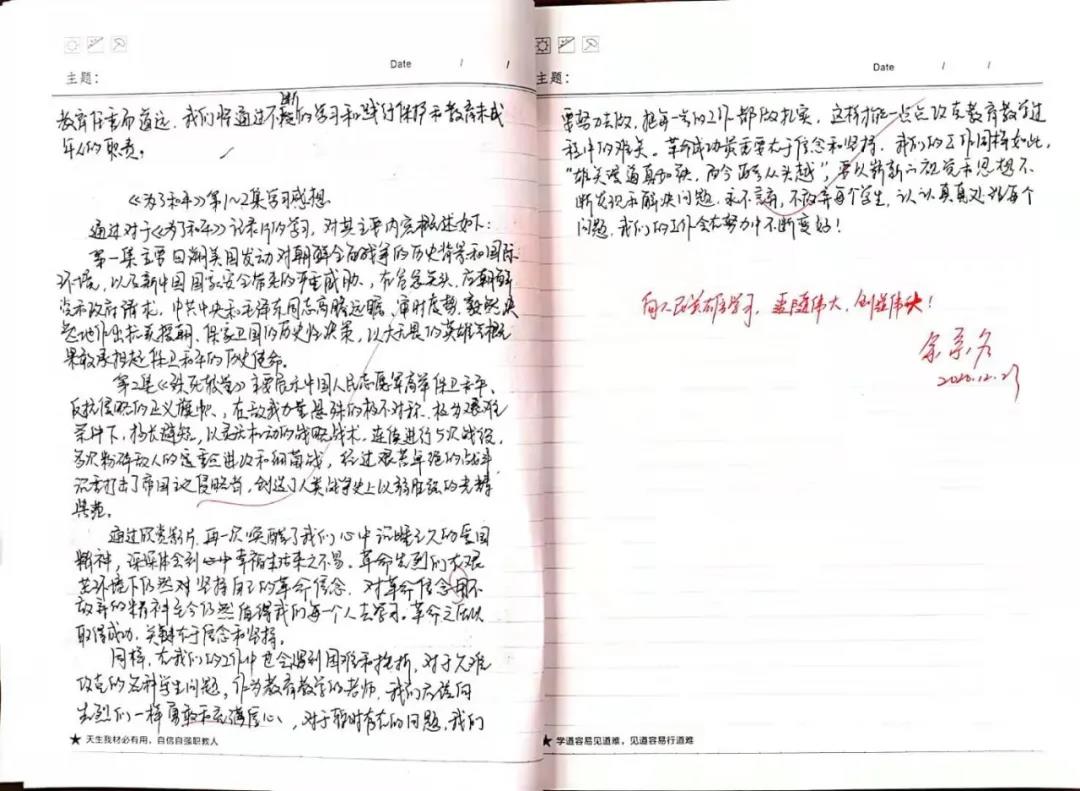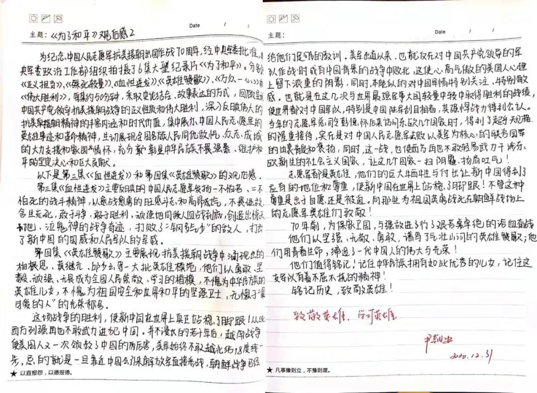 视频感人心,观后意难平。观影后,每位老师围绕“观看后的学习收获”和“立足本岗如何做好工作”,认真撰写学习笔记与心得感想,字里行间抒发了缅怀英雄先烈,珍惜伟大胜利,砥砺民族复兴之志,表达对祖国的热爱与自豪感。