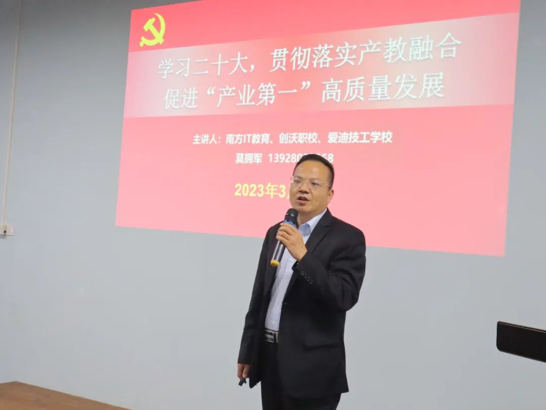 学习分享会上,我校党支部书记莫拥军带领在座企业代表一同深入学习,回顾学习党的二十大报告的主题和15条核心内容,围绕“实施科教兴国战略,强化现代化建设人才支撑”核心内容,统一思想、凝聚共识,深化校企合作,畅谈学校发展规划蓝图、人才培养目标和校企育人、产教融合的着力点,携手争做全面建设社会主义现代化国家新征程的生力军。