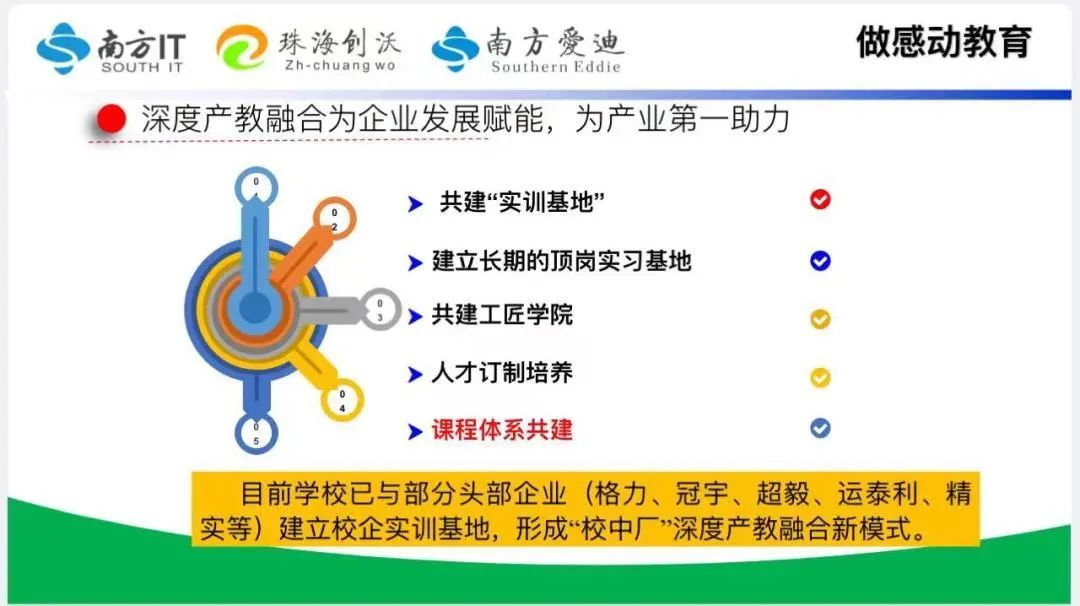 南方爱迪积极构建党建互联、业务互帮、发展互动的校企合作模式,以党建共建为载体,在加强队伍建设、推动产教融合、共建合作基地、培养技能人才、共办文体活动等方面展开交流,将党建工作与学校内涵发展有机结合,推动校企合作深入开展,助力珠海市“产业第一,制造业当家”战略,打造技工教育、产教融合、蓝领金领技工的名片,增强人才造血功能,为区域经济大发展做贡献。