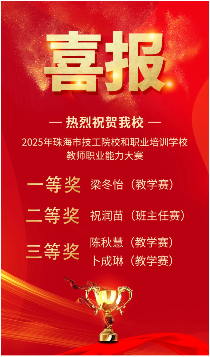 教育的动人之处,不仅在于学子的成长,也在于师者的绽放。在近期举办的2025年珠海市技工院校和职业培训学校教师职业能力大赛上,我校四位老师凭借扎实的学识、出色的教学能力载誉而归。她们在平凡岗位上的用心耕耘,于赛场上绽放出耀眼的光彩。