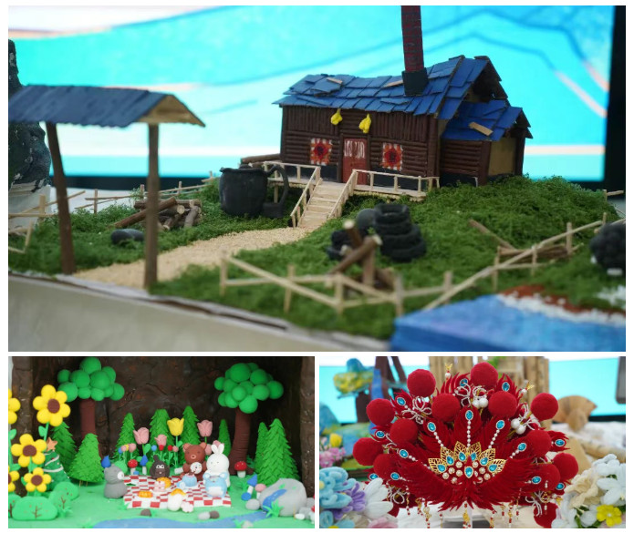 报告厅外,此刻也自成一道动人风景。走廊两侧整齐陈列着同学们亲手制作的手工作品——充满巧思的环保裱花、栩栩如生的纸艺创作、色彩绚丽的黏土雕塑……每一件都凝聚着他们对儿童世界的理解与想象。
