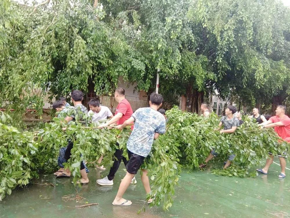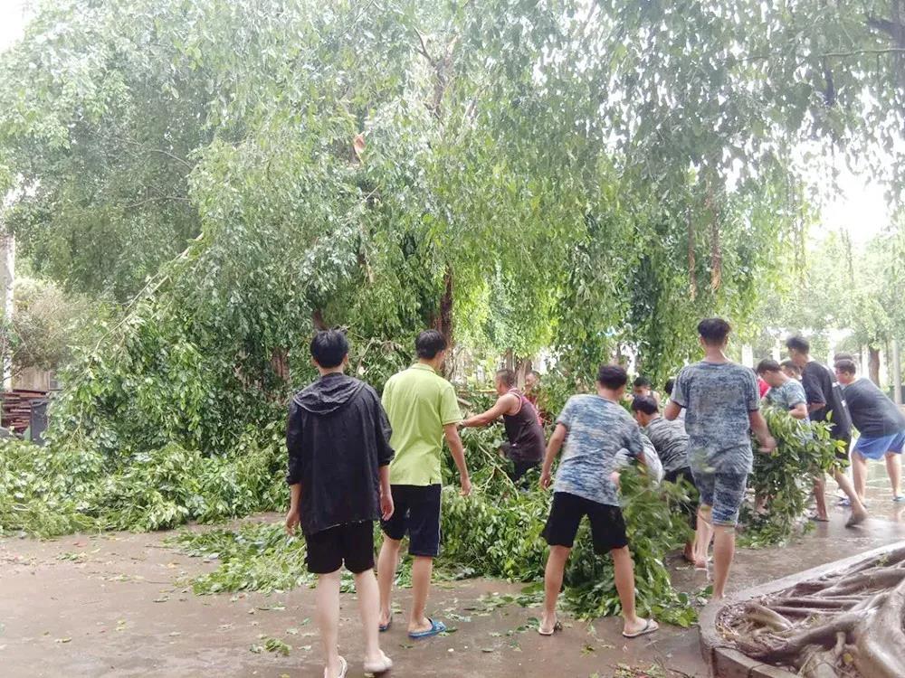 在学校领导的带领下,师生们准备好各种工具,在校内开展了清扫活动,首先清理倾倒的树木和折断的树枝。这可是一件力气活,老师们身先士卒,勇敢地冲在第一线,充分体现了老师作为榜样的示范力量!