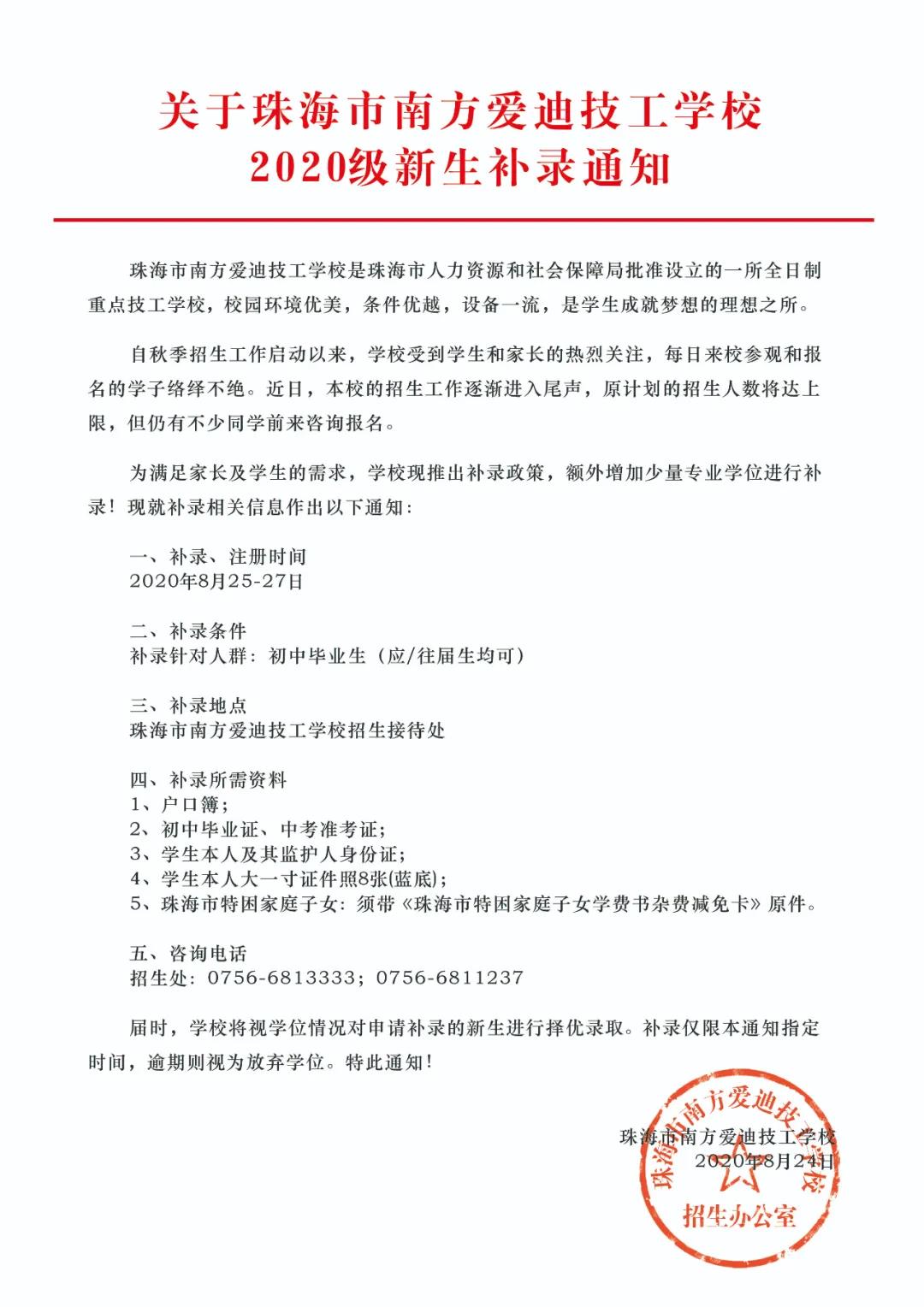 关于珠海市南方爱迪技工学校2020级新生补录通知
