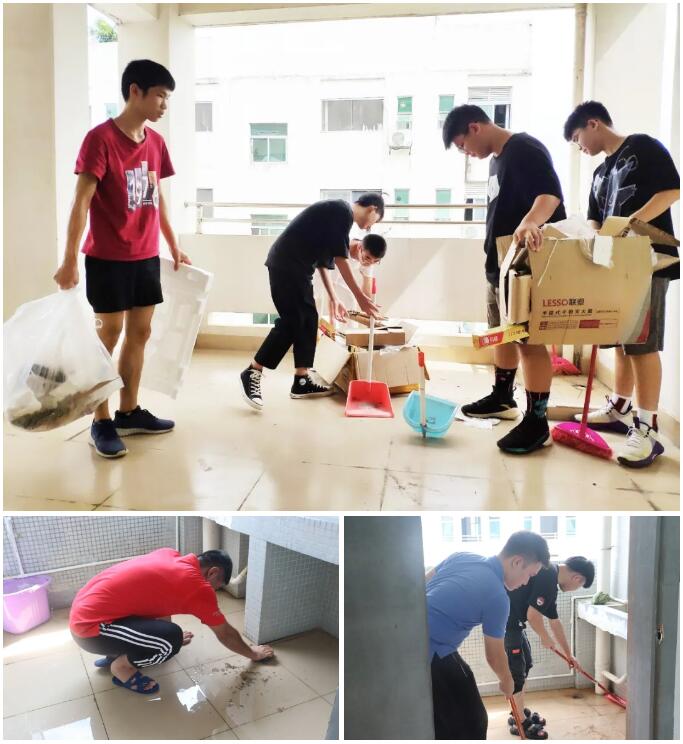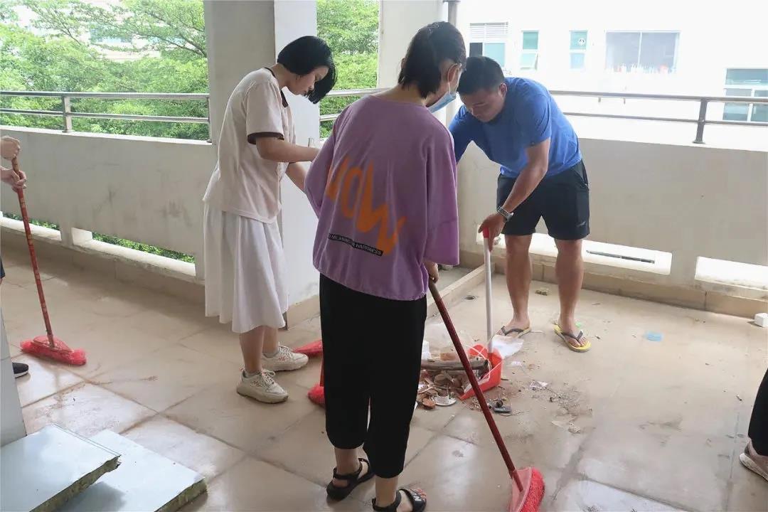 杂乱的宿舍里,满是老师们、师兄师姐们忙碌的身影,清理垃圾、洗刷地面、擦窗户、擦床板……志愿者们就像突击队一样,所到之处,灰尘不见,地板尽净,不留任何卫生死角,就连洗漱台上的污垢和楼梯上灰尘也逃不出他们的火眼金睛!
