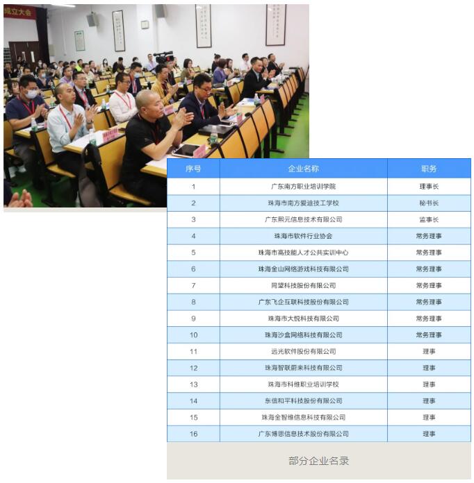 赋能珠海智能制造,推动信息技术服务产业的高质量发展,珠海市人力资源鉴定考试院梁家全院长、软件行业协会黄华婕秘书长、市高技能人才公共实训中心张红艳部长、我校创始人曾凡明校长以及上述企业代表一同出席了联盟成立仪式,领导嘉宾欢聚一堂,共同商讨联盟发展大计,合作共赢,共谋发展。