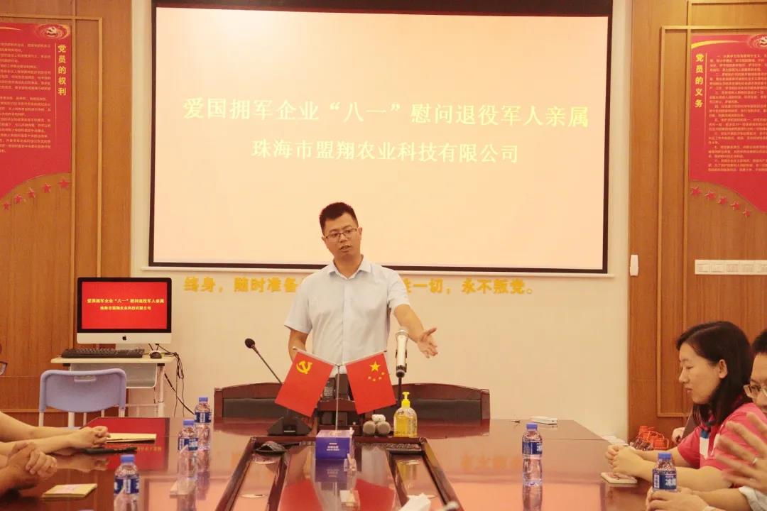 为进一步弘扬拥军优属的优良传统,切实增强军人和军属的政治荣誉感和归属感,表达对退役军人及其亲属的崇高敬意,7月29日,在斗门区退役军人事务局的组织下,珠海市盟翔农业科技有限公司(以下简称“盟翔农业”)代表来到我校,进行“八一”慰问退役军人亲属,为他们送去爱国拥军企业的关怀与温暖。