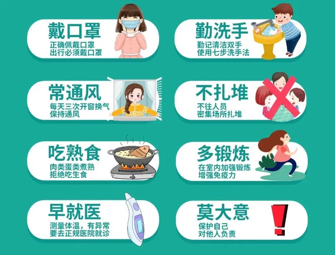 六、要时刻保持个人防护意识,科学佩戴口罩,勤洗手、常通风、保持安全社交距离;不扎堆、不聚会,保持良好的卫生习惯和健康生活方式,不参加大型聚集性活动。主动遵守属地防控规定,积极配合排查和管理。