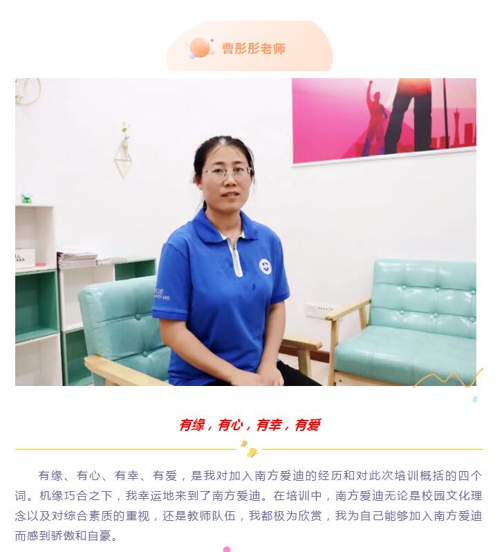 学习是美的遇见。参加了教师训练营,思想灵魂得到了洗礼,我收获颇丰,更能感受到学校对感动教育的认真与南方爱迪教育人坚守的那份初心;从早到晚,体会学生的作息时间、强身健体的八段锦、每一天的力行劳动使我们幸福,一幕幕,无不是用一种坚定的信念将我包围。
