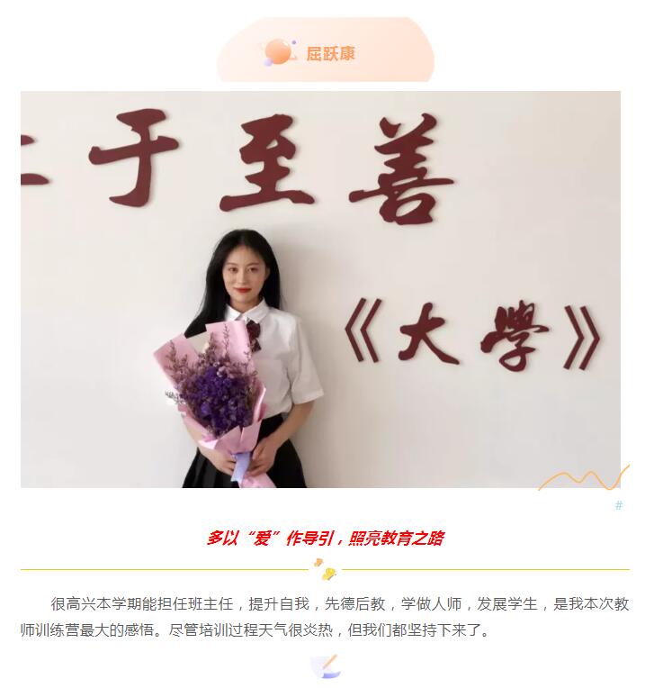 要把缘分转化成福分,重在“有心”。经过两轮集训,军事训练、学习力打造、义工力行等课程中,我们能提前熟悉学生们的生活学习规律,感同身受他们的经历和情绪,提升对学校的归属感以及同事间的亲近感,加深对教学的了解和学习。作为一名教师我会努力提高自己的德行、才行。