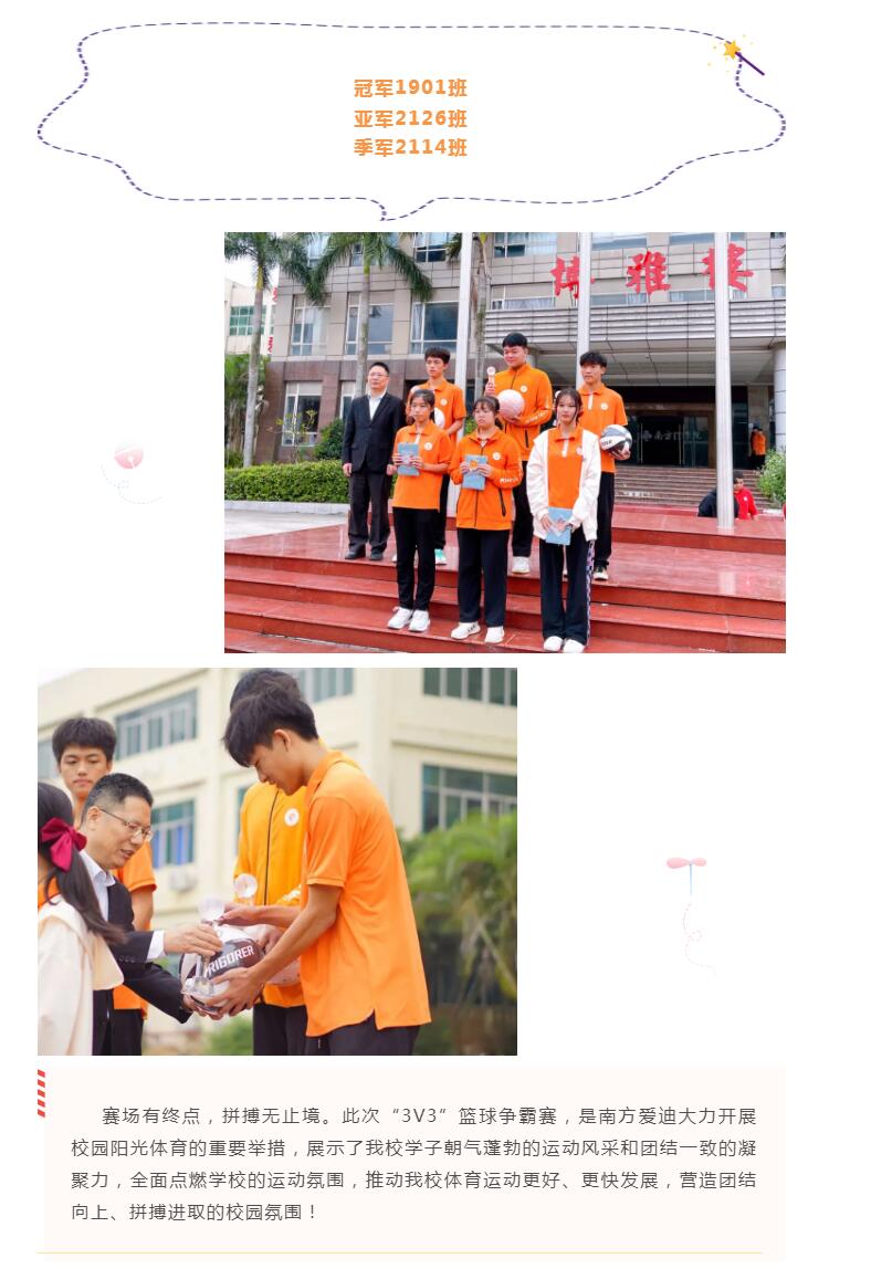 为促进校园体育蓬勃发展,丰富同学们的课余生活,增强全体师生的健身意识和班级凝聚力,提升身心素质,10月28日,南方爱迪技工学校2021年3v3篮球争霸赛“终极之战”强劲来袭,大力掀起了校园阳光体育运动热潮。