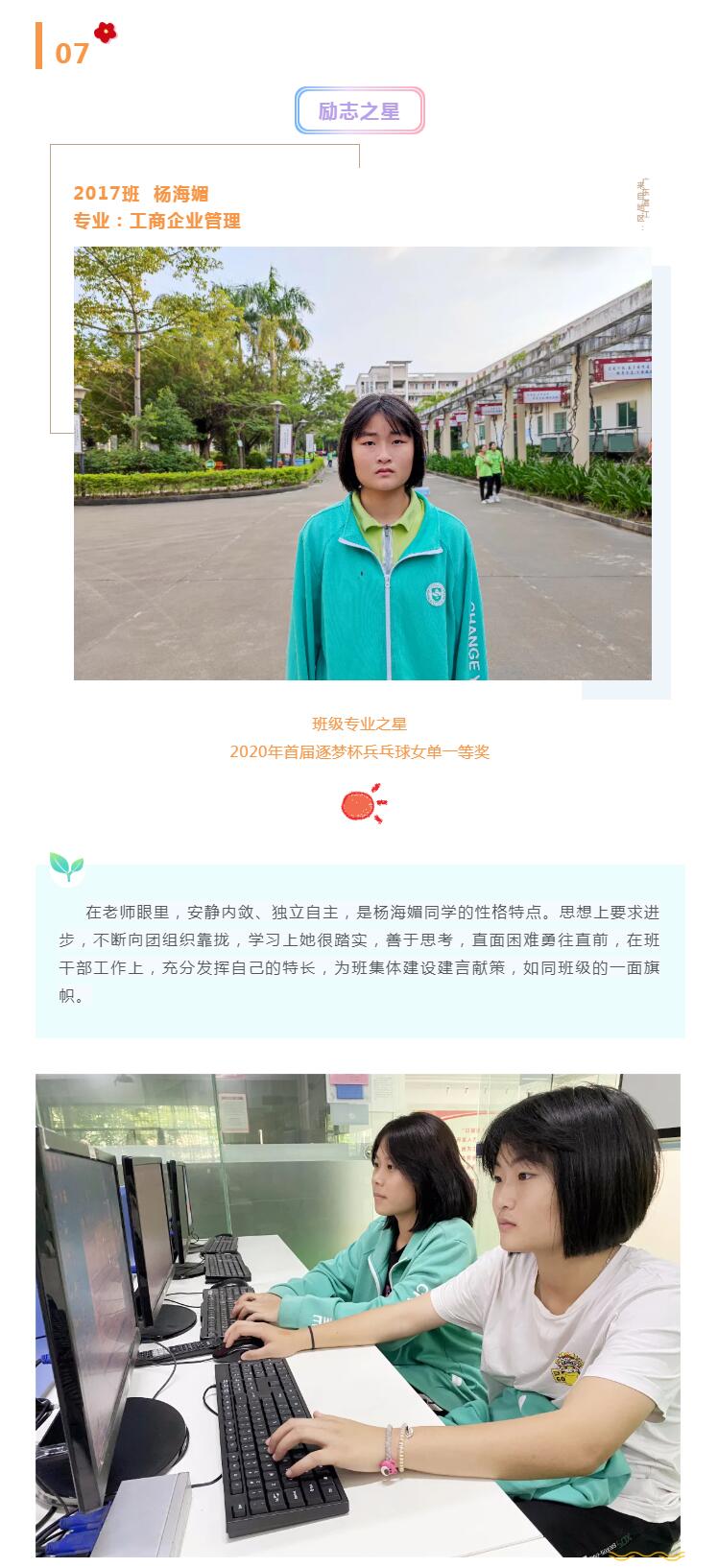 在技能成才的路上,她像一支安静的笔,一张洒满阳光的纸,与2007班的同学,带着乐观与梦想,一同奔跑在青春路上。