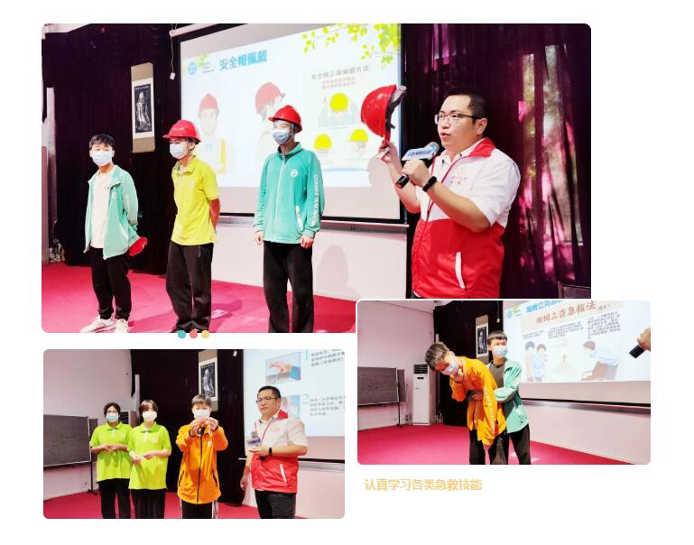 珠海市工伤预防导师龙晓华为学生带去了“AED及心肺复苏”“海姆立克急救法”两项应急救援知识培训。并针对工伤预防中高频使用的安全帽、防护耳塞及灭火器进行现场实物教学。学生纷纷积极参与互动,努力学习可以助人自救的紧急救援技能,整个课堂生动活泼,气氛热烈。