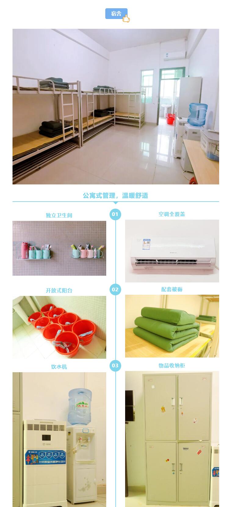 学校住宿条件优越,生活便利、环境优美。宿舍全部为8人间,均有独立卫生间和开放式阳台,室内配备齐全的设备,空调、饮水机、组合学生桌、储物柜等一应俱全。室内二十四小时热水供应,打造温馨小家。
