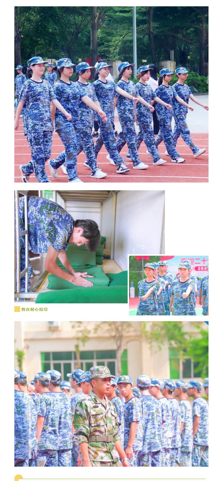 训练场上,队列训练、素质拓展活动井然有序,同学们热情高涨、精神饱满,教官悉心指导、严抠细训,老师们坚持跟训、坚守岗位,后勤人员保障有力、服务贴心,全体人员都以佳的姿态接受领导们的检阅。