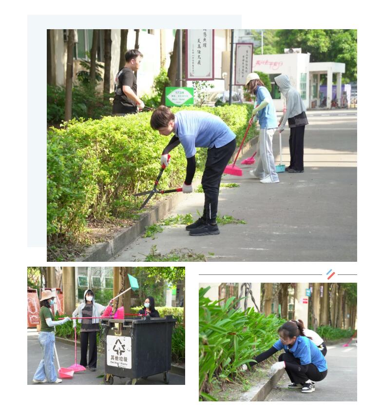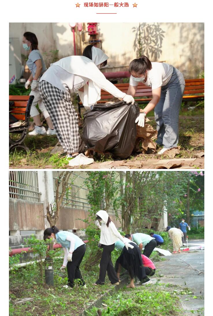 绿化丛里,老师们拿起扫帚、簸箕、抹布、铲刀等清洁工具,干劲十足,认真做好杂草清除、灌木修剪等各项工作。伴随着接连不断的“沙沙”声,一座座落叶堆成的“小山”被扫入簸箕,一株株植被向阳而生、健康成长。