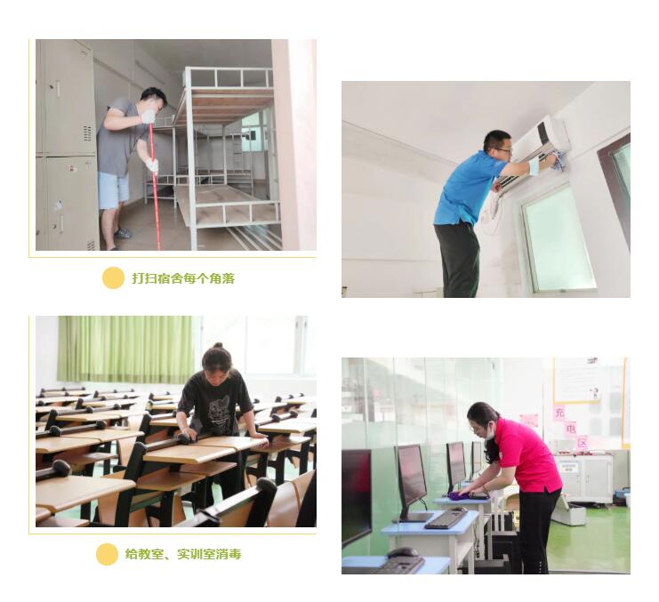 昔日学生们的良师益友,此刻撸起袖子,为大家打扫地面、擦拭窗台、开窗通风、收拾垃圾、摆放桌椅,清扫每个角落的灰尘,进行无死角的杀菌消毒,他们分工有序,有条不紊地穿梭在各班教室、宿舍间,让其焕然一新,一举一动都充满着对学生归来的期待。