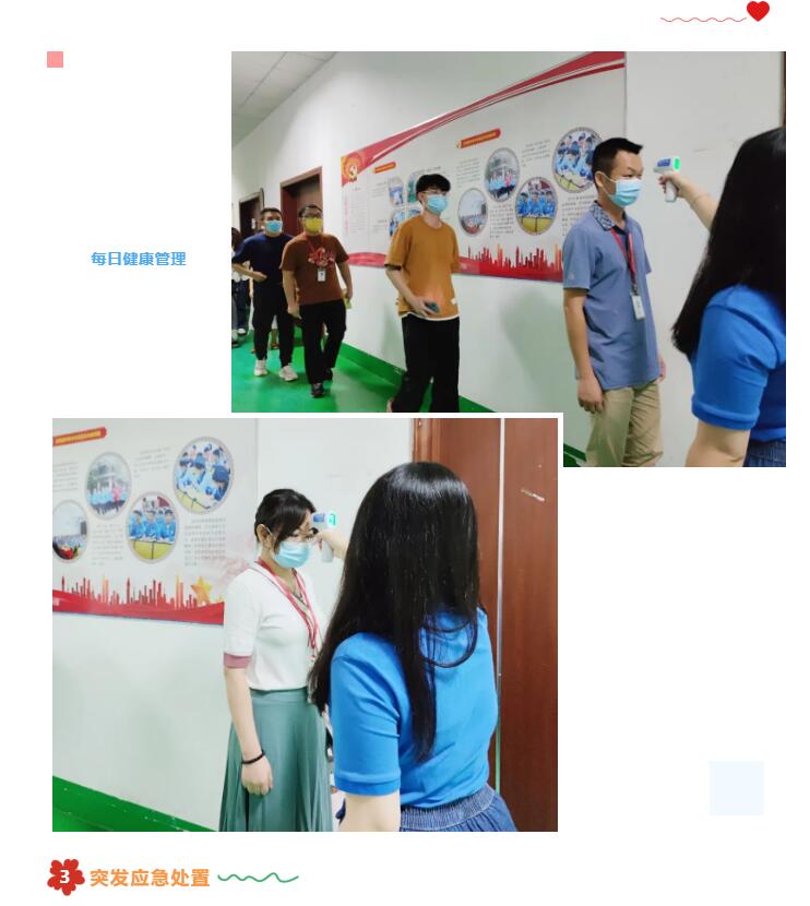 学校大门是校园疫情防控的第一道防线。踏进校门前,每一位同学都要佩戴好口罩,间隔1.2米有序排队,检测体温。若发现学生体温异常,立即报告学校疫情防控领导小组,迅速启动应急处置流程。