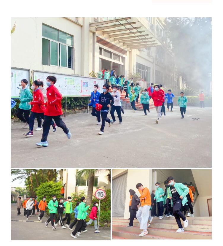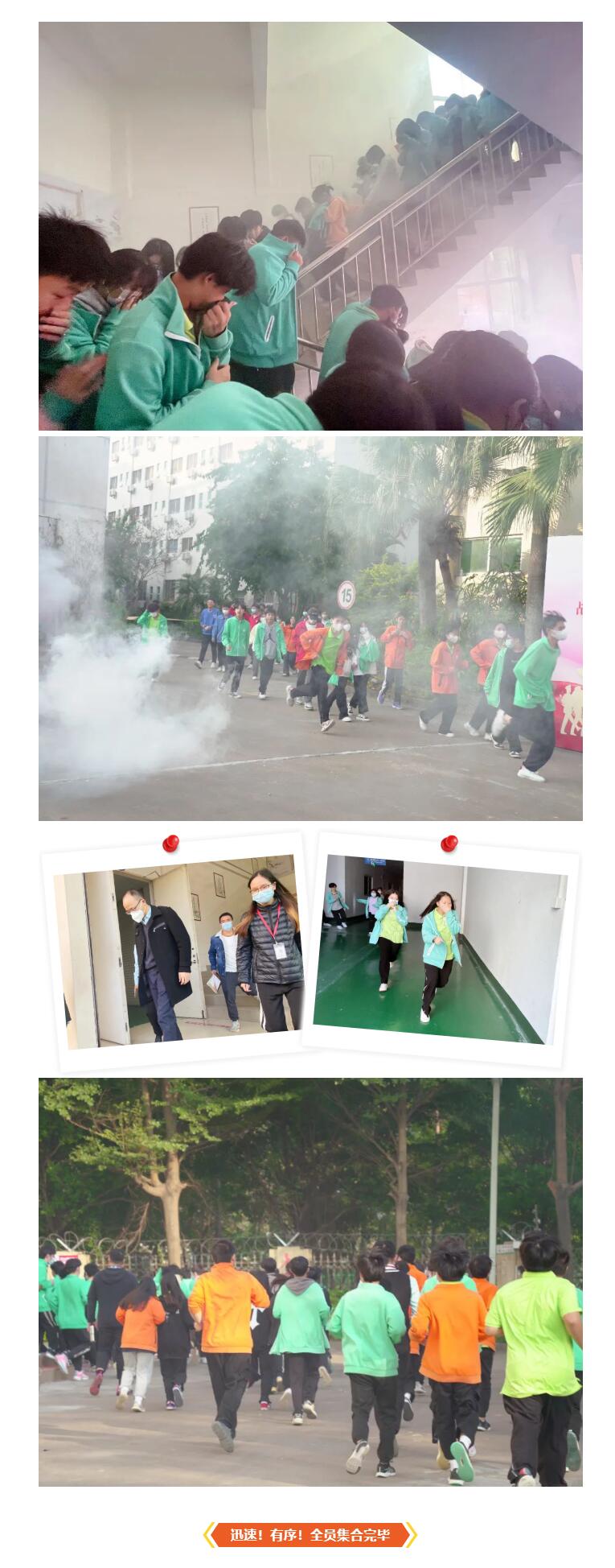 一股白烟飞速弥漫,一声鸣笛突然响起,划破校园朗朗读书声,此刻应急消防演练活动正式开始!全校师生沉着冷静,学生在老师的引导下迅速撤离教室,他们手捂口鼻,低头弯腰,按照消防逃生路线有序撤离,疏散到指定的安全区域。现场秩序良好,撤退有序而不慌乱。