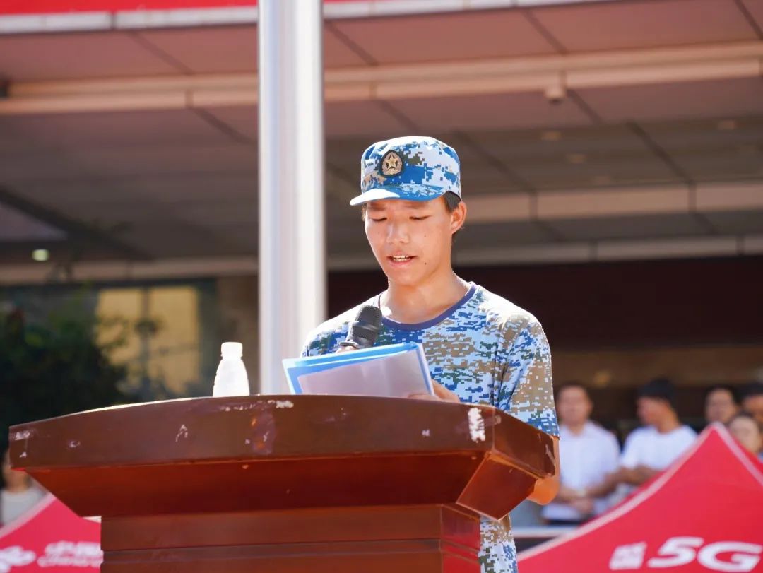 216班胡建宇同学代表2023级参训学生发言,他分享了军训的收获与成长,表达了对教官和老师的感激之情。他表示,爱红装更爱武装,从军训中我们学到永不言弃的精神,收获了面对挫折的勇气,未来愿做利刃,整装待发,为国增光!