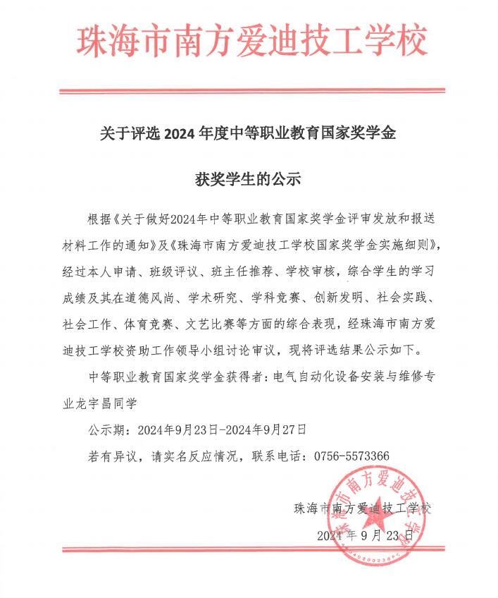 关于评选2024年度中等职业教育国家奖学金获奖学生的公示