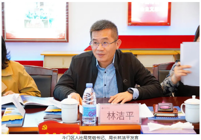 参观结束后,双方在党建会议室展开了专题研讨。斗门区人社局党组书记、局长林洁平首先发言,他就校企合作、人才培养、服务企业用工等“政校企”工作的开展情况进行了详细介绍。