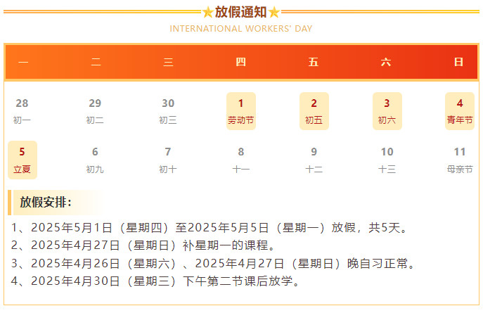 假期来临,愿大家尽享欢乐时光,同时务必将安全摆在首位!家长们请认真履行监护责任,做好安全教育与日常监护;同学们也要增强安全意识,时刻注意自身安全。让我们携手筑牢安全防线,守护健康成长。衷心祝愿大家五一假期快乐!