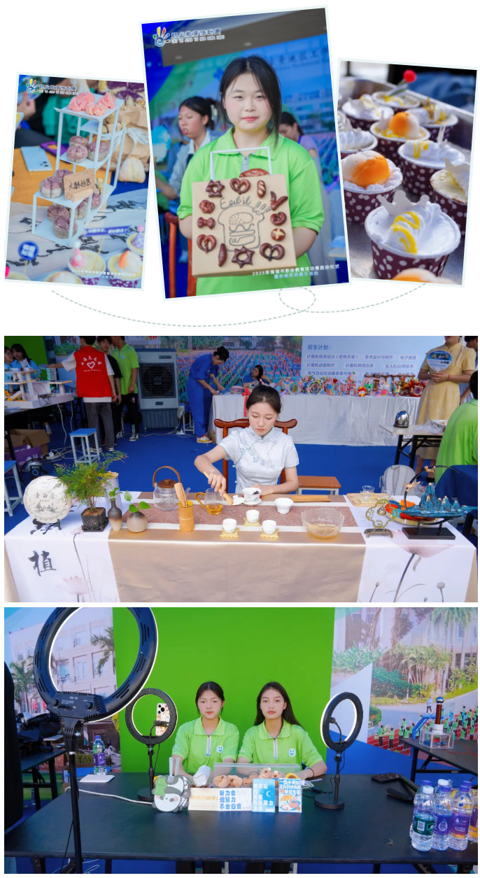另一端,茶艺表演区茶香袅袅,尽显优雅韵味;烹饪专业作品色香味俱全,引得人垂涎欲滴;电子商务的学子们活力满满,在直播间里热情地推销产品。他们妙语连珠,与观众积极互动,将专业知识与实战能力展现得淋漓尽致。在这里,你能真切感受到南方爱迪的魅力,体验到科技与创意碰撞出的奇妙火花。