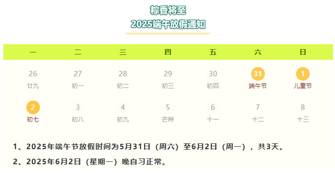 端午佳节将至,粽香与节日的欢乐气息已悄然弥漫。依据国家法定节假日规定,结合学校实际,现将端午放假安排及相关注意事项通知如下,愿大家度过一个平安、祥和又充实的假期。