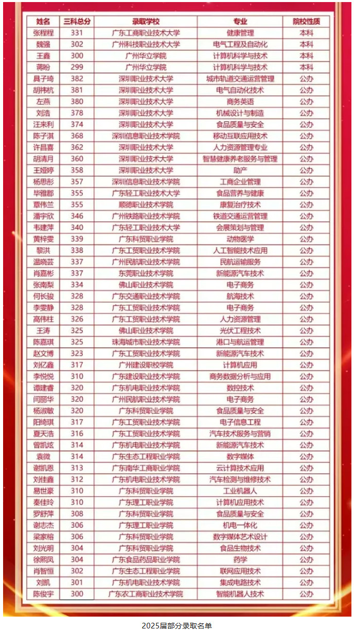 通过高职高考,我校一大批学子考上本科、专科院校,如:嘉应学院(本科)、韩山师范学院(本科)、南京传媒学院(本科)、深圳职业技术大学(“双高计划”院校)、广东轻工职业技术大学(“双高计划”院校)等省内“就业王牌”院校。