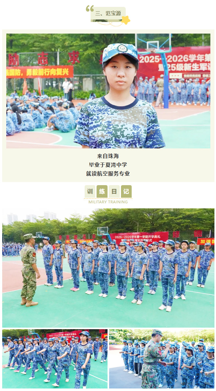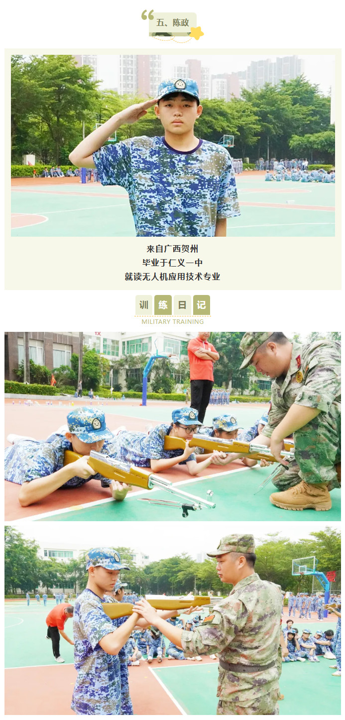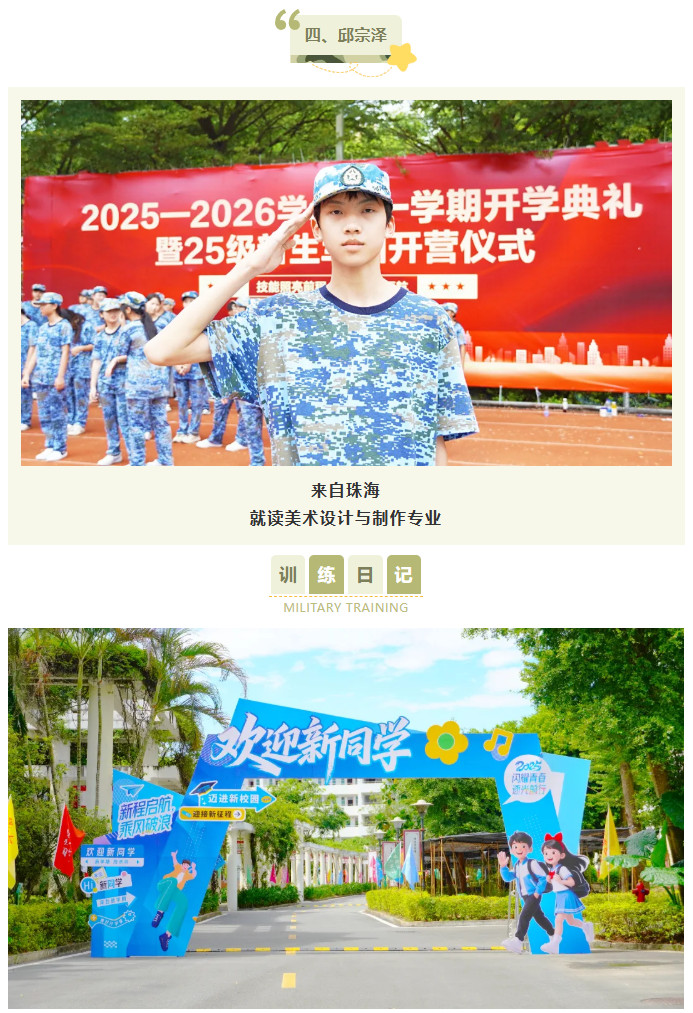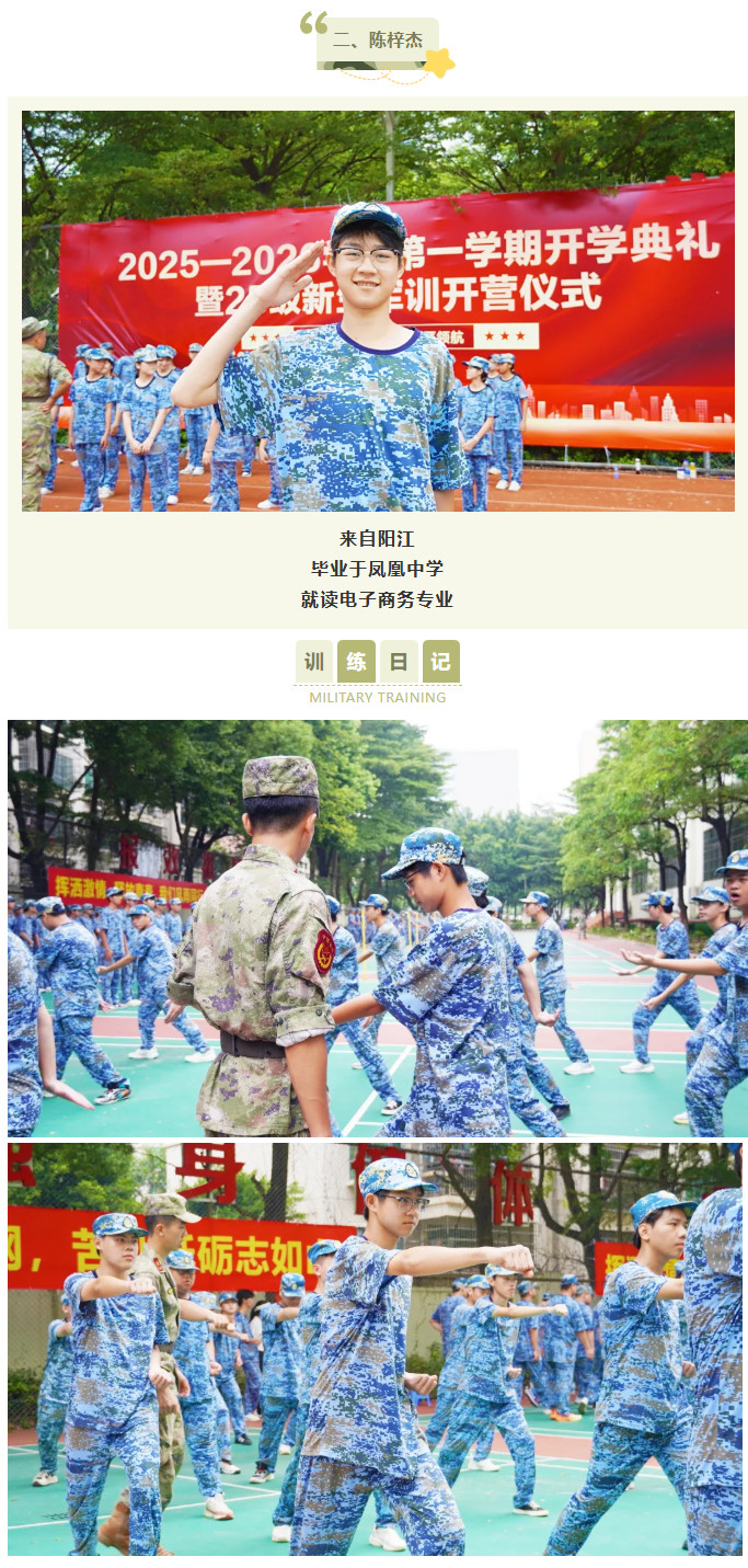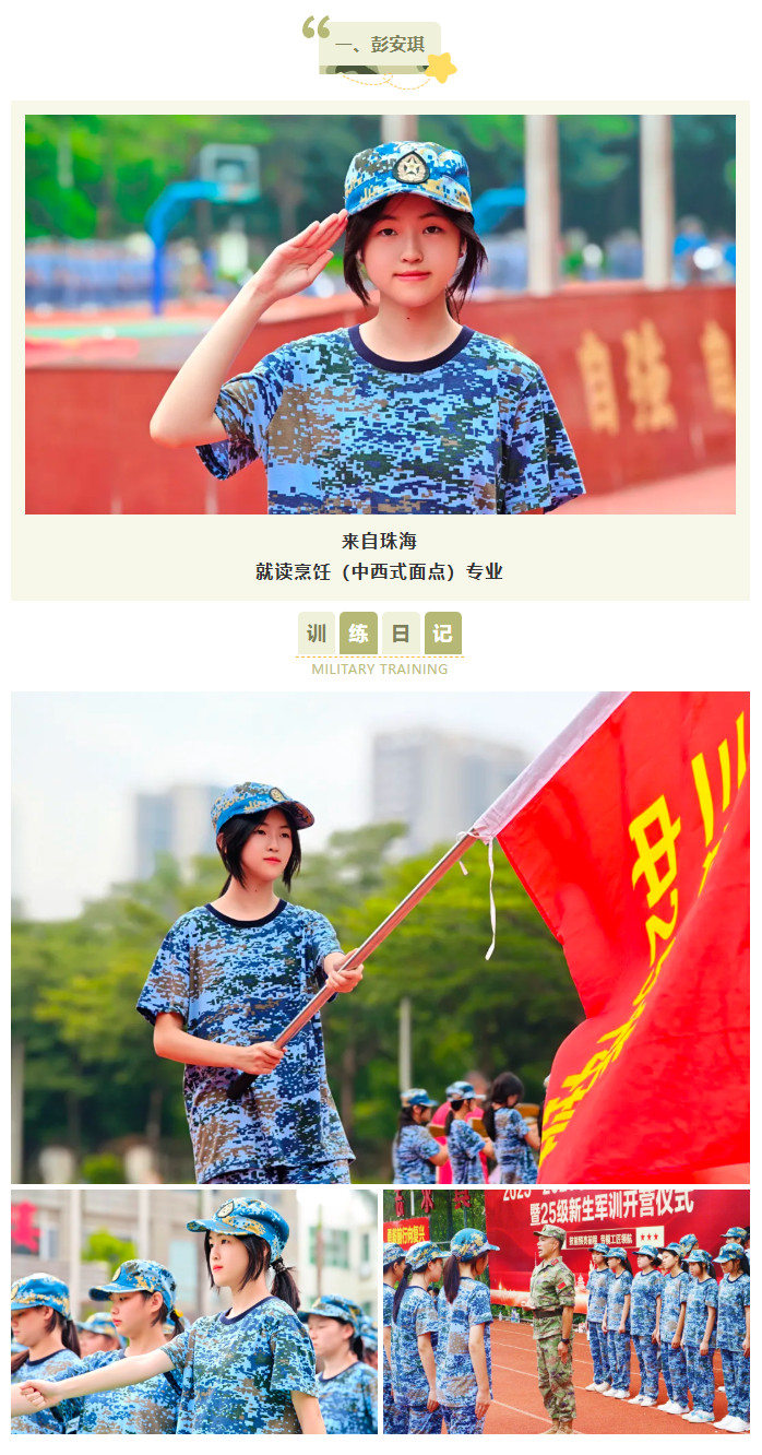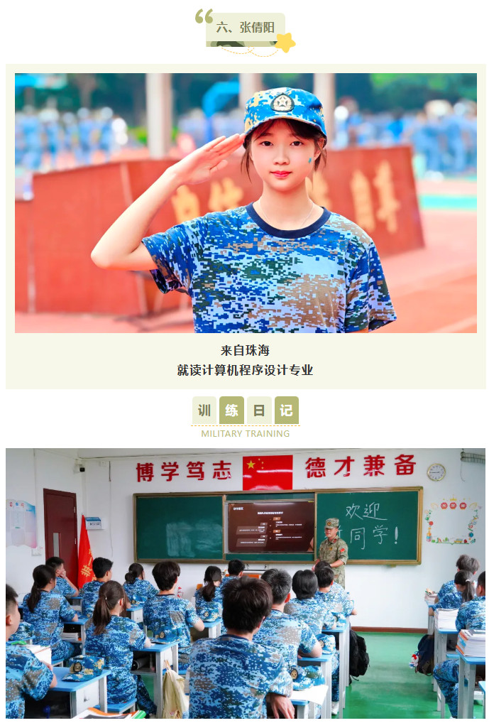 站军姿对我改变很大,一开始总站不稳,现在能一动不动挺很久,耐心和专注力都提高了不少。每天训练完去食堂吃饭特别香,晚上也睡得很踏实。我报读的是美术设计与制作专业,特别希望以后能学好绘画,用画笔把这段珍贵的时光记录下来!