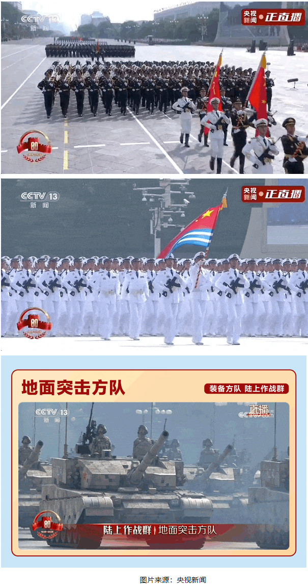 阅兵式正式开始后,官兵们整齐的步伐、挺拔的军姿、高昂的士气,一下子就抓住了所有人的目光??罩刑荻雍粜ザ?,徒步方队铿锵有力,装备方队气势磅礴,全方位展现了新时代中国军队的崭新风貌。