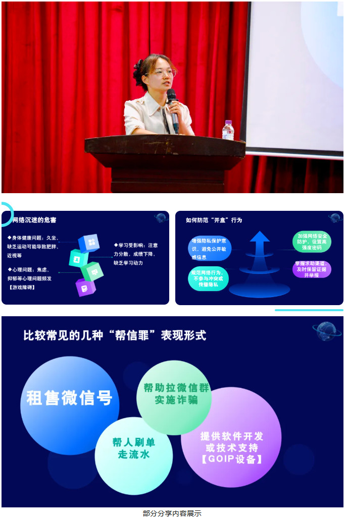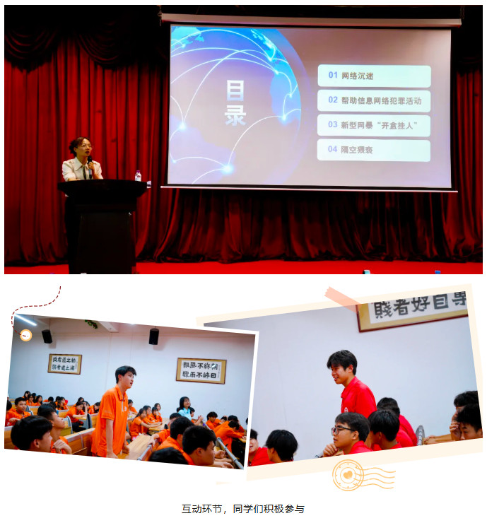 讲座中,杨股长围绕网络沉迷、帮助信息网络犯罪活动、新型网暴“开盒挂人”等几个方面,通过一系列鲜活的案例分析,生动展现了网络犯罪的多样性和危害性。她不仅详细阐述了这些行为背后的法律条文,还结合青少年的心理特点,用通俗易懂的语言告诫同学们要增强自我?;ひ馐?,远离网络犯罪的诱惑和侵害。