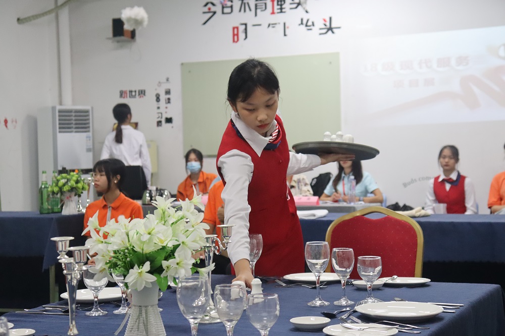 主要承担中西餐宴会摆台项目的教学和训练。实训室模拟高星级酒店中西餐厅实际场景,配备全套中西餐服务用具,培养学生摆台服务、菜肴服务、酒水服务的实际技能。