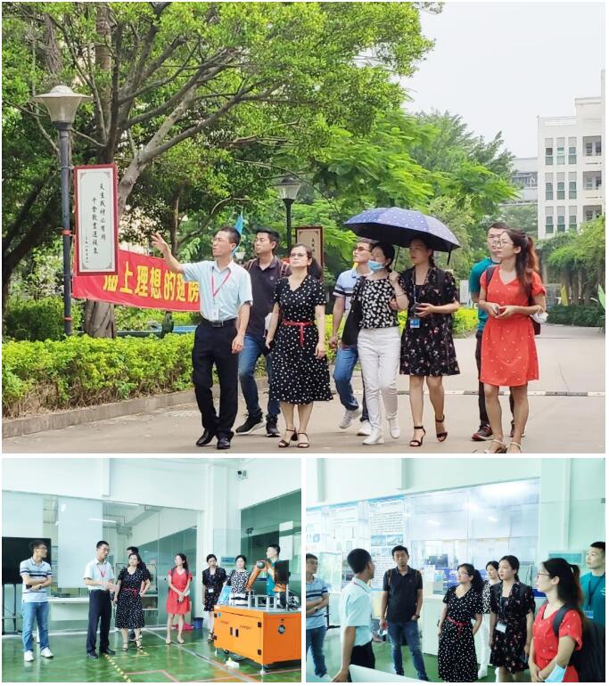 企业嘉宾一行先后参观了我校的校容校貌、校园文化长廊、各专业实训室、社团室和党建基地。期间,学校领导逐一介绍了校园文化建设、特色教育、办学成果、校企合作实训基地等内容,嘉宾一行认真倾听,亲身感受到我?;蛏系男H菪C病V患┳耪胄7难ё用谴┧笤诨肪秤琶赖男T澳?,一个个精神昂扬,朝气蓬勃,让嘉宾们印象深刻,称赞不已。