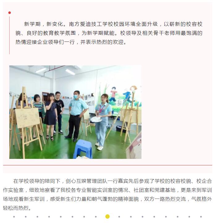 金秋九月开学季,砥砺奋进正当时。校企合作育人才,深度融合共发展。9月10日,南方爱迪技工学校迎来了珠海金山软件剑心互娱董事长王屹、总经理杨琦、美术总监杨月、运维总监杨雪等一行领导莅临学校参观考察,双方共商人才培养、校企合作发展大计。